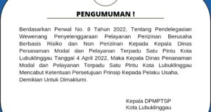 PENGUMUMAN ! Berdasarkan Perwal No. 8 Tahun 2022 Tentang Pendelegasian Wewenang Penyelenggaraan Pelayanan Perizinan Berusaha Berbasis Resiko dan Non Perizinan Kepada Kepala Dinas Penanaman Modal dan Pelayanan Terpadu Satu Pintu Kota Lubuklinggau Tanggal 4 April 2022. maka Kepala Dinas Penanaman Modal dan Pelayanan Terpadu Satu Pintu Kota Lubuklinggau Mencabut Ketentuan Persetujuan Prinsip Kepada Pelaku Usaha. Demikian untuk dimaklumi. Kepala DPMPTSP ...