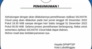 Sehubungan dengan akan dilakukannya pemeliharaan Aplikasi SICANTIK Cloud yang akan dilakukan pada hari jumat tanggal 30 Desember 2022 Pukul 19.30 WIB sampai dengan hari Sabtu tanggal 31 Desember 2022 Pukul 00.00 WIB. Selama proses pemeliharaan berlangsung, Maka untuk sementara Aplikasi SICANTIK Cloud tidak dapat diakses. Mohon maaf atas ketidaknyamanan nya.