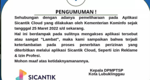 Pemberitahuan informasi perbaikan gangguan pelayanan perizinan berbasis Aplikasi “SICANTIK”. Sehubungan dengan adanya pemeliharaan pada Aplikasi Sicantik Cloud yang dilakukan oleh Kementerian Kominfo sejak tangggal 25 Maret 2022 s/d sekarang. Hal ini berdampak pada sulitnya mengakses aplikasi tersebut atau sangat “Lambat”, maka kami sampaikan bahwa terjadi keterlambatan pada proses penerbitan perizinan yang diterbitkan melalui aplikasi Sicantik Cloud, Seperti izin Reklame & ...
