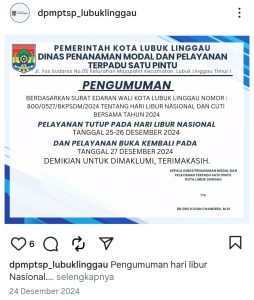 Pengumuman Surat Edaran Wali Kota Lubuk Linggau tentang Hari Libur Nasional dan Cuti Bersama tahun 2024.